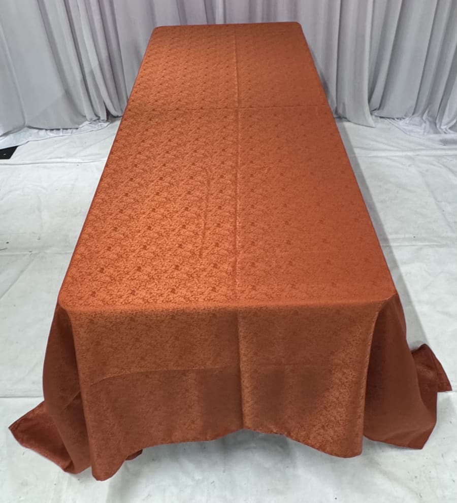 Make your events truly special with our Covington Rectangular - Burnt Orange tablecloth! Perfect for 6ft rectangular tables, this stunning floor-length tablecloth adds a touch of elegance to any occasion. Whether you're hosting a wedding, a corporate event, or a special celebration, this tablecloth is a must-have for your decor.