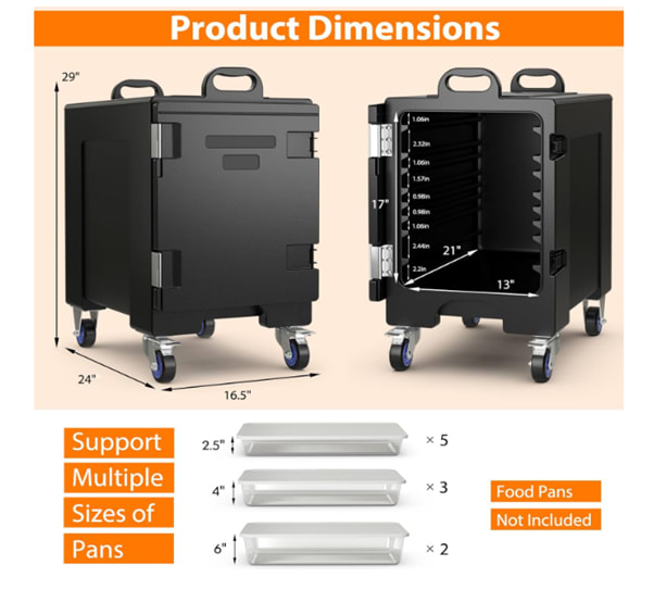 With an impressive 81-quart capacity, this food pan carrier can hold up to 5 full-size food pans of hot or cold food. The various intervals allow you to place different sizes of food trays as needed. This makes it an ideal choice for canteens, restaurants, large-scale hotels, and corporate gatherings. From appetizers to main courses and desserts, keep all your dishes at the right temperature and ready to serve.