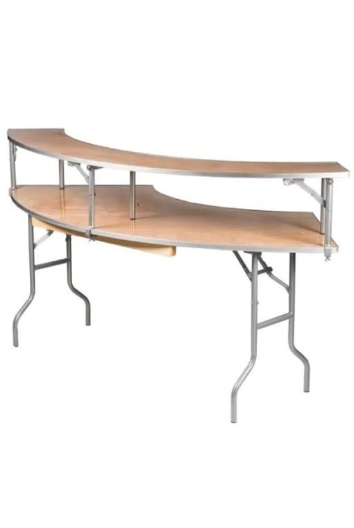 Impress your guests with the versatile Serpentine Table Wooden Top 7ft, perfect for adding a touch of elegance to your event setup. This table, measuring 84" x 30" x 2.5", is ideal for creating buffet stations, dessert stations, and more, making it a must-have for any event planner or host.