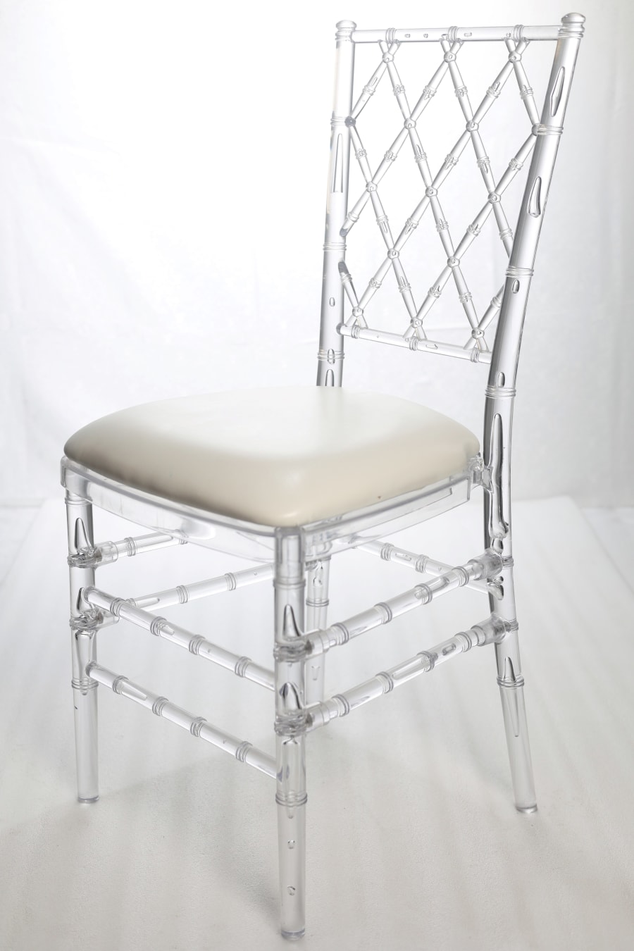 The clear Diamond Back Chiavari Chair comes with a white padded seat for maximum comfort, allowing your guests to relax and enjoy the event in style. 💫 While these chairs are perfect for indoor venues, please note that they are not suitable for grass or gravel flooring. 🚫