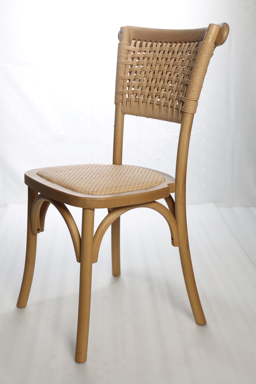Crafted from durable rattan and wood, our chair is not only beautiful but also sturdy and reliable. The intricate rope back detail adds a charming touch, making it a standout piece in any event space.