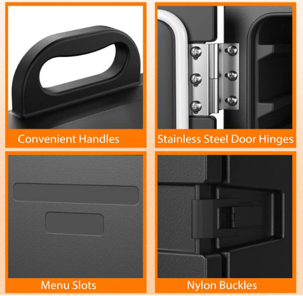 Our insulated food box is equipped with two ergonomic handles, making it easy to carry wherever you need. The door opens to a maximum angle of 270 degrees, allowing for effortless loading and unloading of food pans. This practical design ensures that your food handling process is smooth and efficient every time.