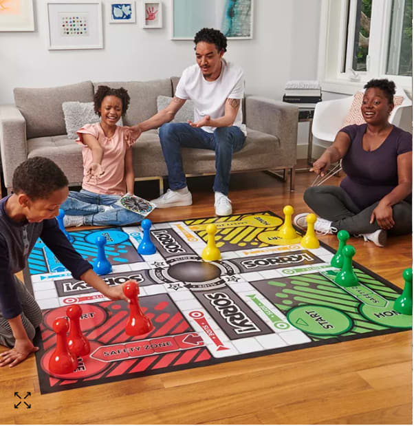 Start by placing your 3 giant pawns on your corner of the expansive 64” x 64” vinyl mat gameboard. Spin the spinner to move your pawns out of the starting area, and then the fun truly begins! Players race to move their pawns around the board, sliding forward on Slider spaces if they’re lucky and getting knocked back to Start if they aren’t. The first player to get all 3 pawns around the board and safely to Home wins the game!