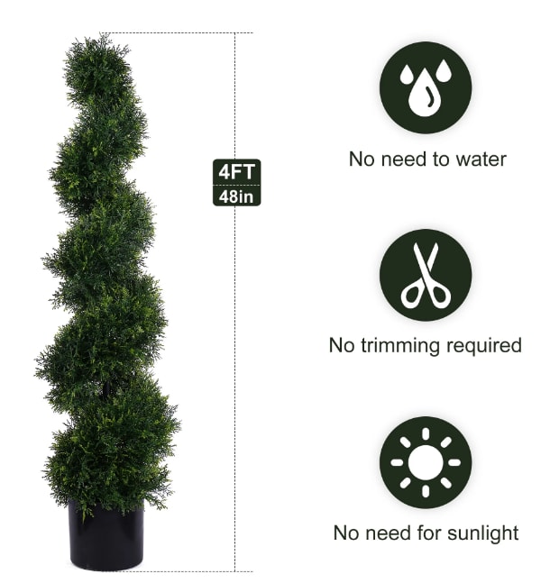 Our Spiral Topiary Tree - 4ft is a versatile and stylish addition to any setting. Its compact size makes it easy to place in various locations, adding a touch of charm and greenery wherever it's placed. Make a statement with this topiary tree and create a visually appealing atmosphere that will impress your guests.