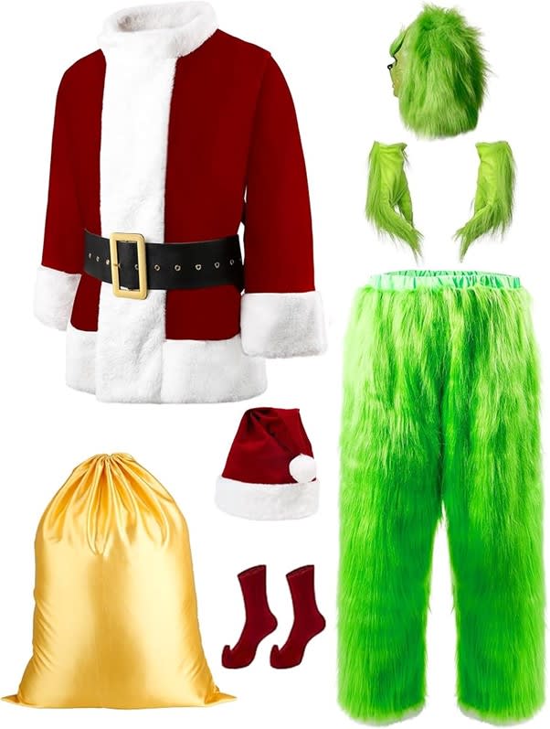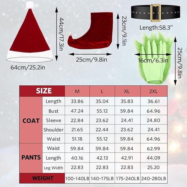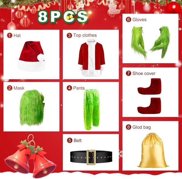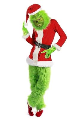 Embrace the character of the Grinch with our all-inclusive costume set. From the furry green gloves to the iconic red Santa hat, every detail has been meticulously designed to replicate the beloved holiday figure. Get ready to have some fun and spread a different kind of Christmas cheer with this standout outfit.