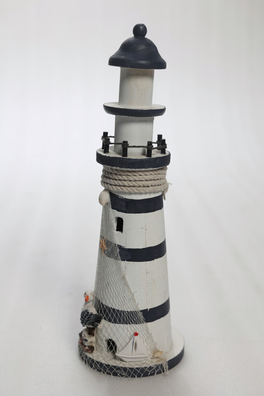 Make a splash at your next themed party or event with our Nautical Theme Centerpiece featuring a charming Blue and White Lighthouse with a decorative net. Standing at 16 inches tall and 6 inches wide, this centerpiece is the perfect addition to any ocean-inspired decor.