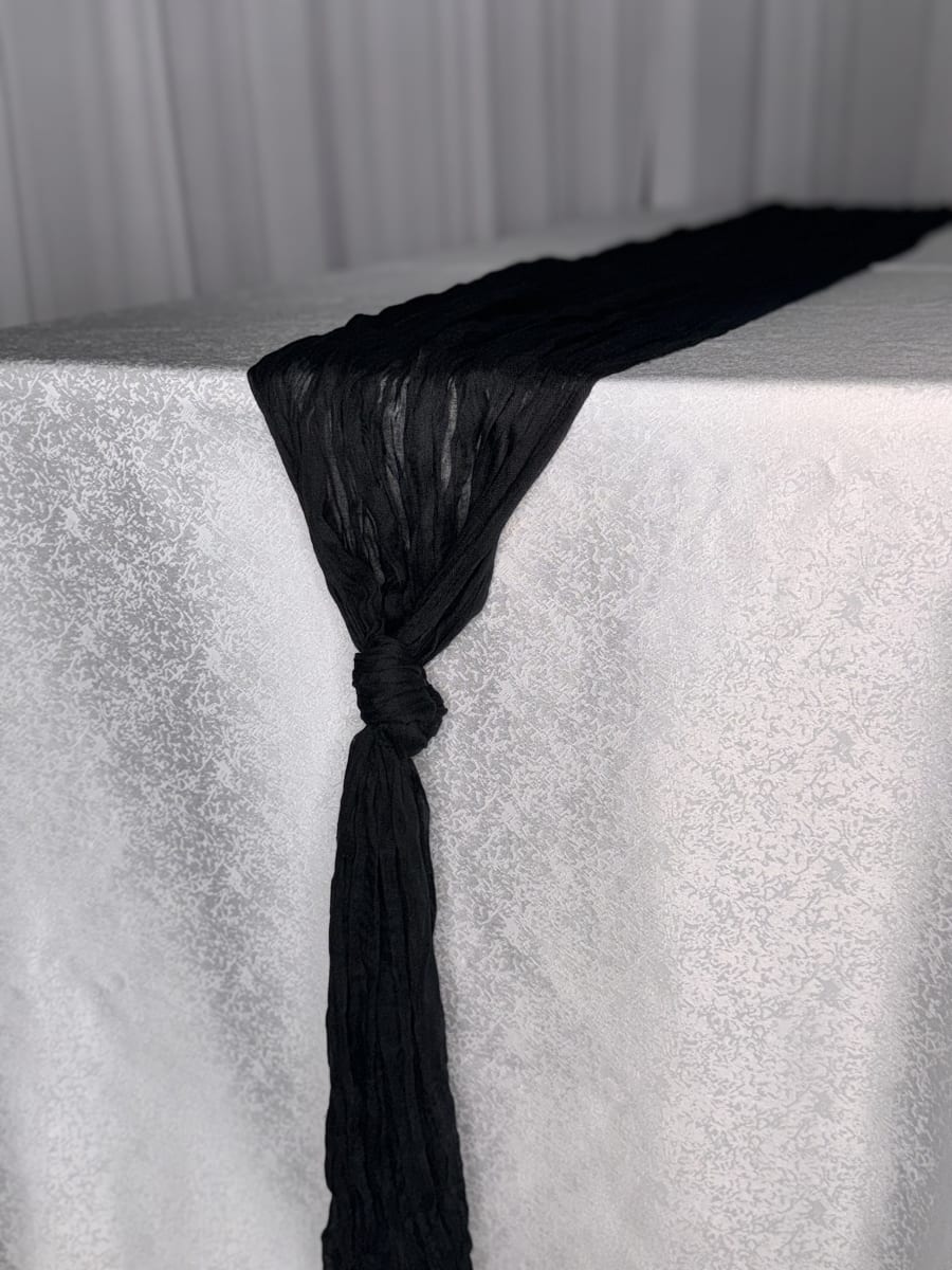 Enhance the look of your special event with our stunning Black Cheesecloth Runner! 🖤 This 12ft long runner adds a touch of elegance and sophistication to any occasion, whether it's a wedding, birthday party, or corporate gathering. The rich black color of the cheesecloth adds a pop of drama to your decor, making it the perfect choice for those looking to create a stylish and modern atmosphere.