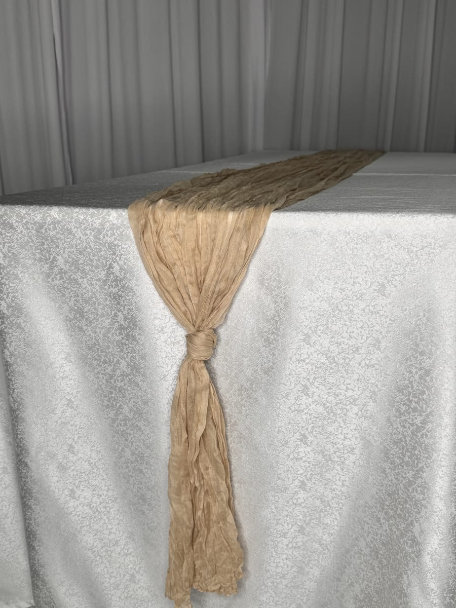 Enhance the look of your special event with our stunning Caramel Cheesecloth Runner! 🖤 This 12ft long runner adds a touch of elegance and sophistication to any occasion, whether it's a wedding, birthday party, or corporate gathering. The rich caramel color of the cheesecloth adds a pop of drama to your decor, making it the perfect choice for those looking to create a stylish and modern atmosphere.