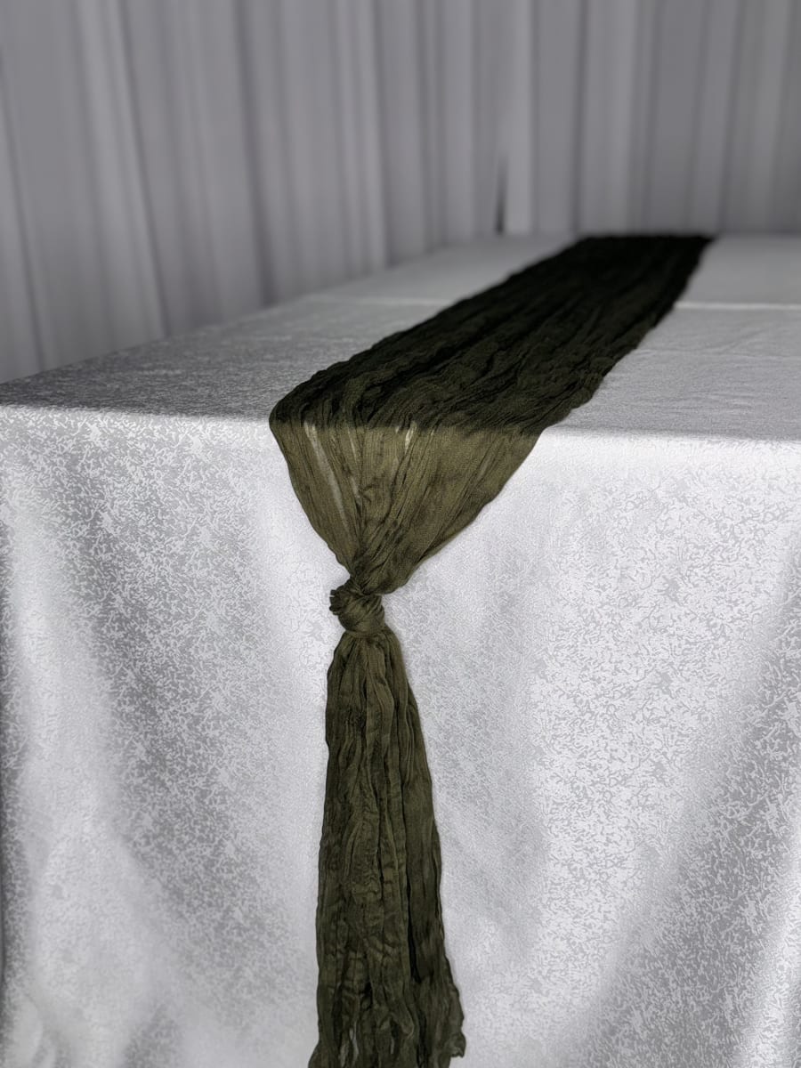Enhance the look of your special event with our stunning Olive Green Cheesecloth Runner! 🖤 This 12ft long runner adds a touch of elegance and sophistication to any occasion, whether it's a wedding, birthday party, or corporate gathering. The rich olive green color of the cheesecloth adds a pop of drama to your decor, making it the perfect choice for those looking to create a stylish and modern atmosphere.