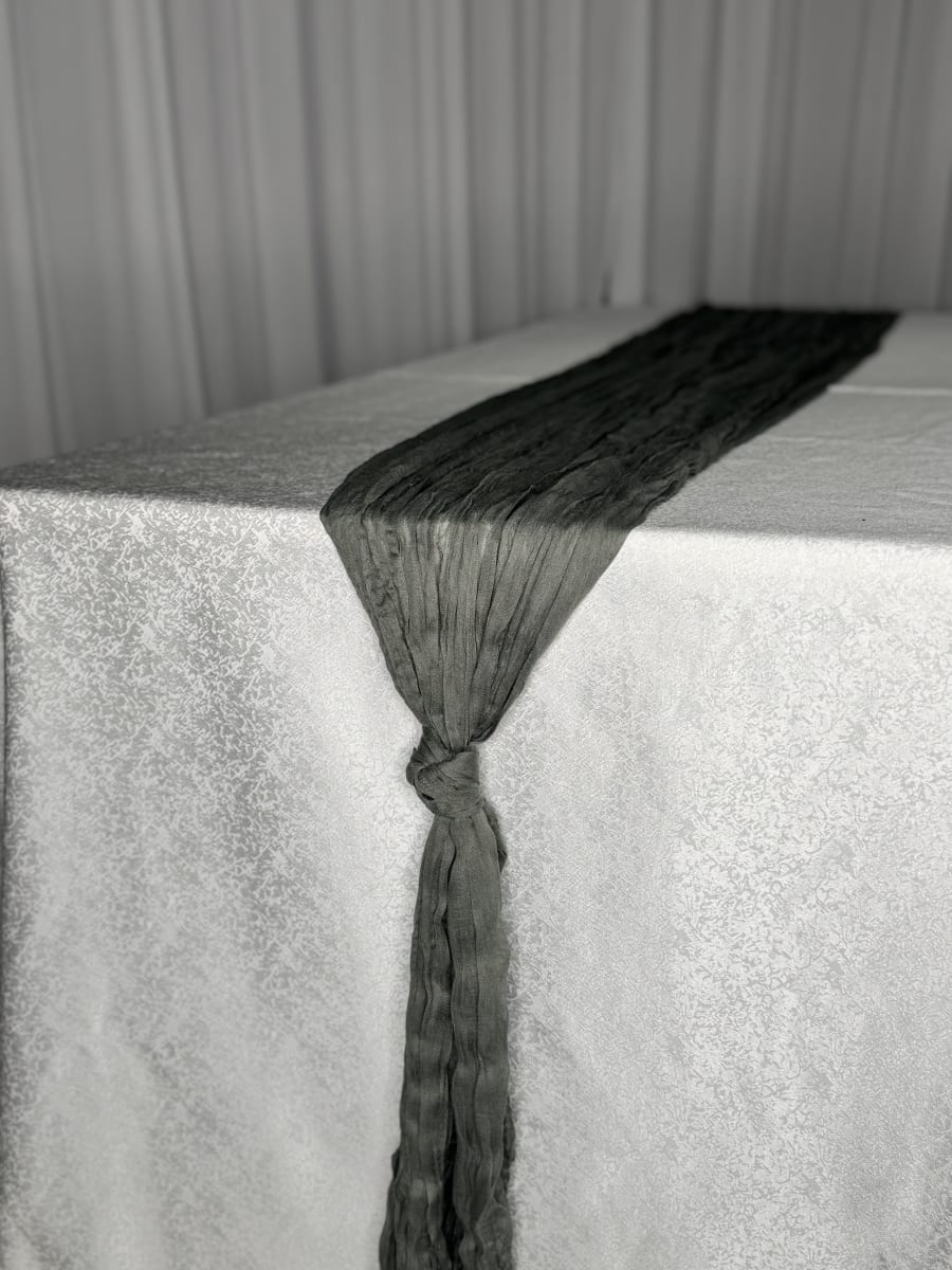 Enhance the look of your special event with our stunning Grey Cheesecloth Runner! 🖤 This 12ft long runner adds a touch of elegance and sophistication to any occasion, whether it's a wedding, birthday party, or corporate gathering. The rich grey color of the cheesecloth adds a pop of drama to your decor, making it the perfect choice for those looking to create a stylish and modern atmosphere.