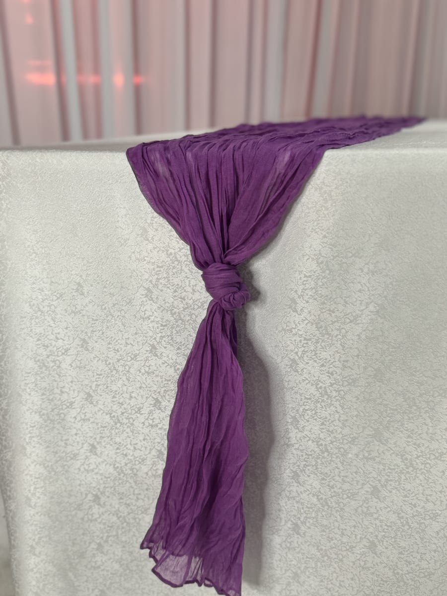 Enhance the look of your special event with our stunning Purple Cheesecloth Runner! 🖤 This 12ft long runner adds a touch of elegance and sophistication to any occasion, whether it's a wedding, birthday party, or corporate gathering. The rich purple color of the cheesecloth adds a pop of drama to your decor, making it the perfect choice for those looking to create a stylish and modern atmosphere.