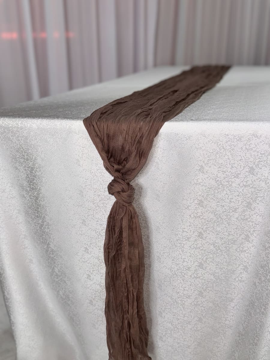 Enhance the look of your special event with our stunning Hazel Cheesecloth Runner! 🖤 This 12ft long runner adds a touch of elegance and sophistication to any occasion, whether it's a wedding, birthday party, or corporate gathering. The rich hazel color of the cheesecloth adds a pop of drama to your decor, making it the perfect choice for those looking to create a stylish and modern atmosphere.