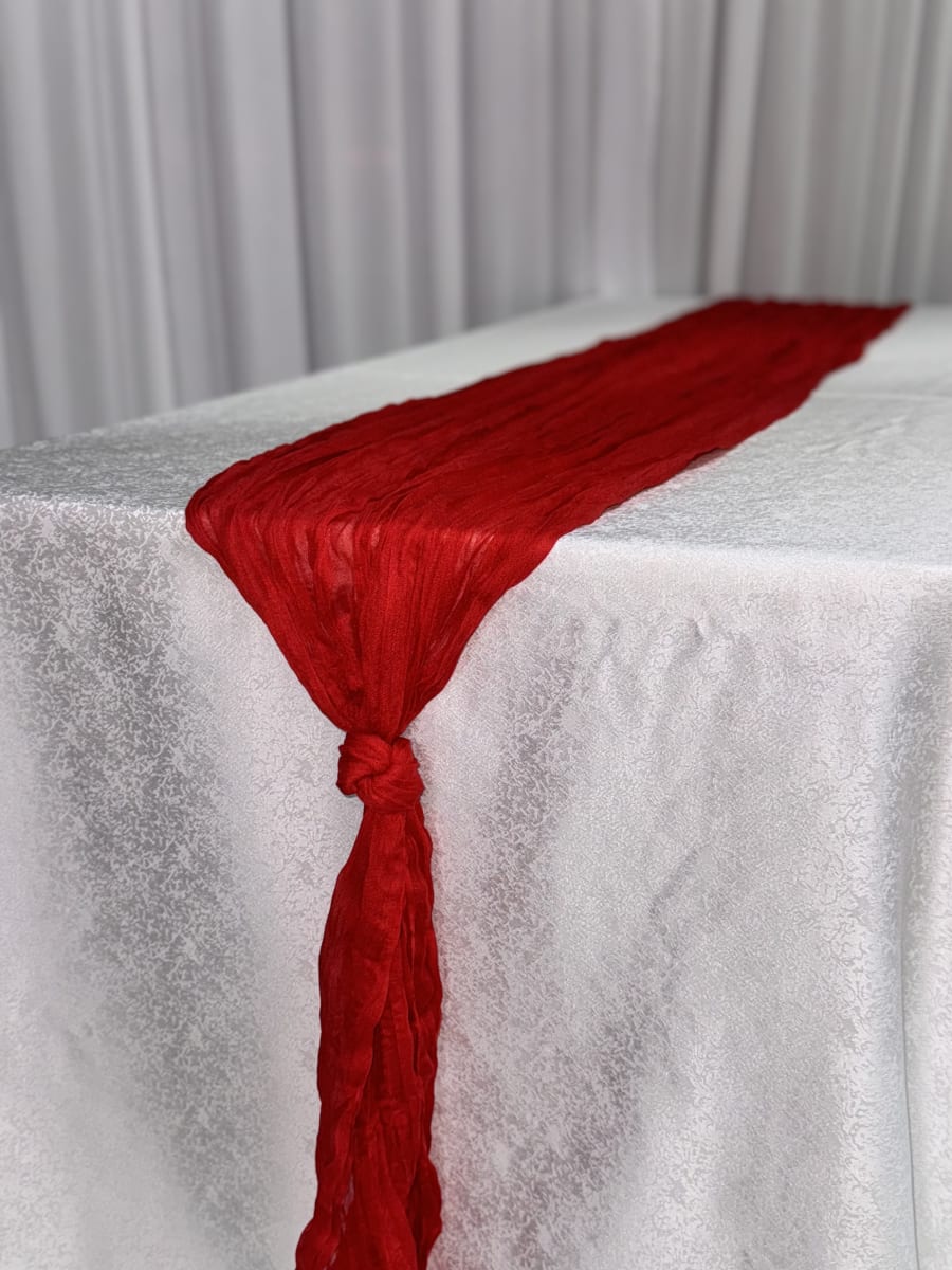 Enhance the look of your special event with our stunning Red Cheesecloth Runner! 🖤 This 12ft long runner adds a touch of elegance and sophistication to any occasion, whether it's a wedding, birthday party, or corporate gathering. The rich red color of the cheesecloth adds a pop of drama to your decor, making it the perfect choice for those looking to create a stylish and modern atmosphere.