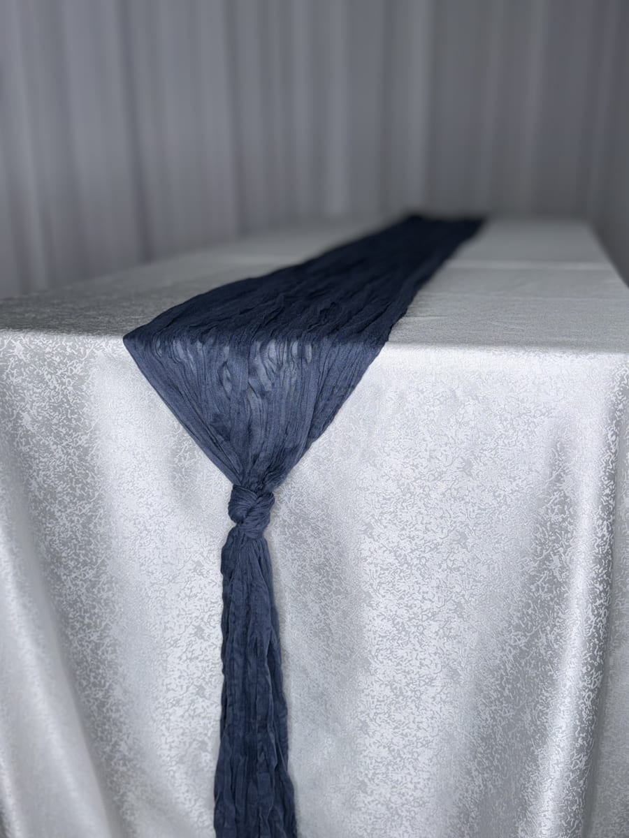 Enhance the look of your special event with our stunning Navy Blue Cheesecloth Runner! 🖤 This 12ft long runner adds a touch of elegance and sophistication to any occasion, whether it's a wedding, birthday party, or corporate gathering. The rich navy blue color of the cheesecloth adds a pop of drama to your decor, making it the perfect choice for those looking to create a stylish and modern atmosphere.