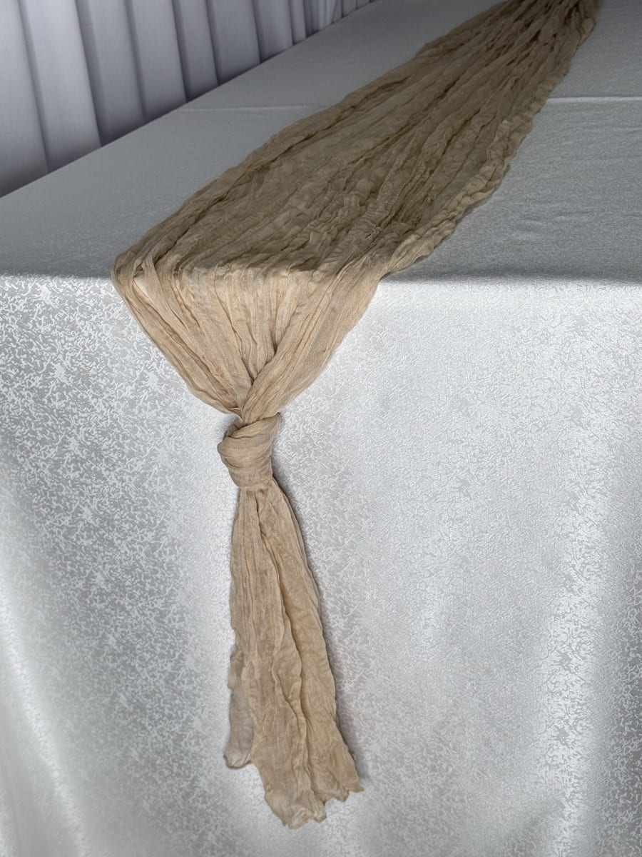 Enhance the look of your special event with our stunning Beige Cheesecloth Runner! 🖤 This 12ft long runner adds a touch of elegance and sophistication to any occasion, whether it's a wedding, birthday party, or corporate gathering. The rich beige color of the cheesecloth adds a pop of drama to your decor, making it the perfect choice for those looking to create a stylish and modern atmosphere.