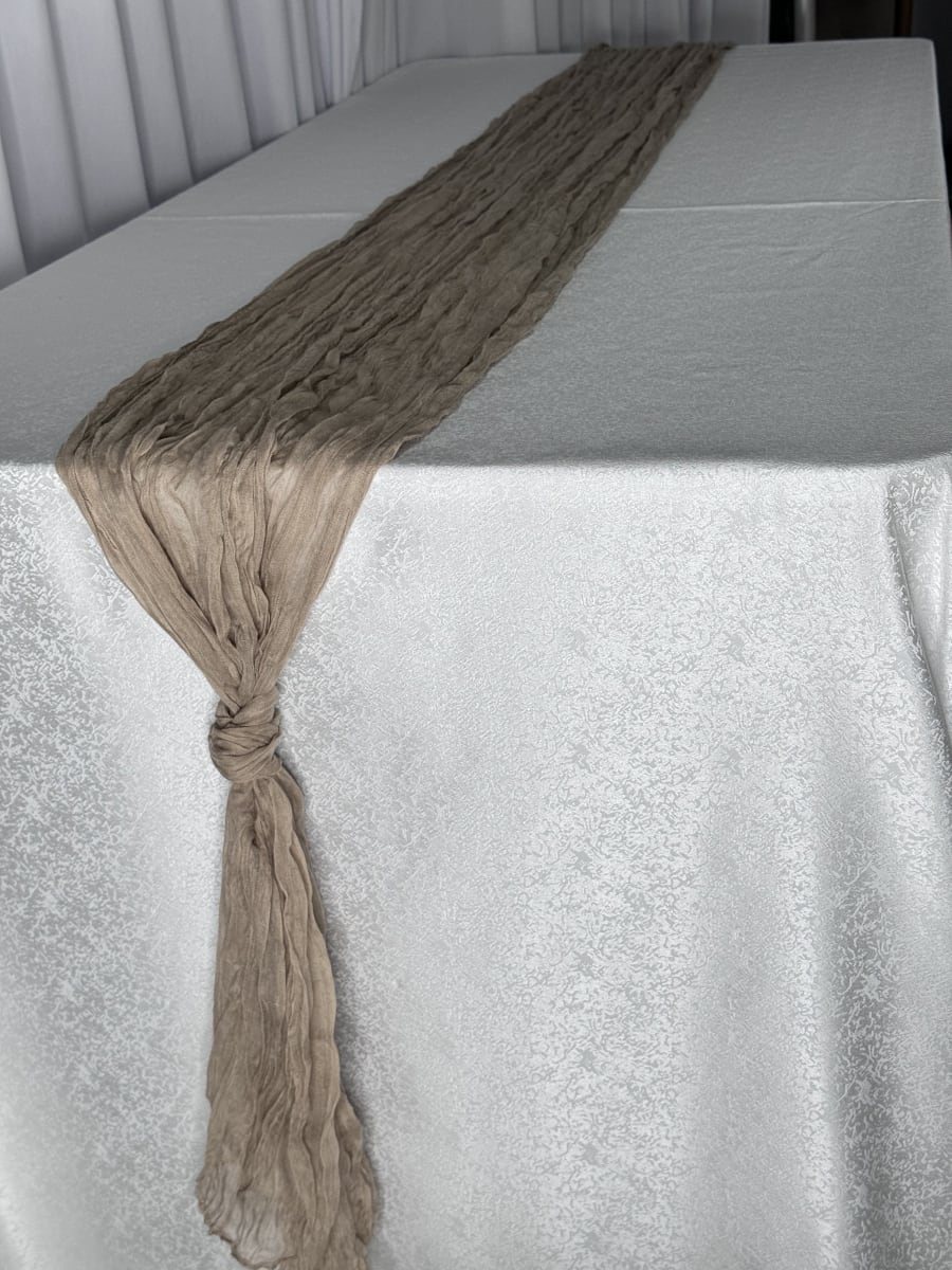 Enhance the look of your special event with our stunning Natural Cheesecloth Runner! 🖤 This 12ft long runner adds a touch of elegance and sophistication to any occasion, whether it's a wedding, birthday party, or corporate gathering. The rich natural color of the cheesecloth adds a pop of drama to your decor, making it the perfect choice for those looking to create a stylish and modern atmosphere.